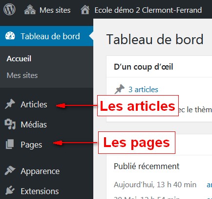 Les Pages forment des entrées du menu. Les nouveaux Articles s’affichent en haut et « poussent » les plus anciens vers le bas.