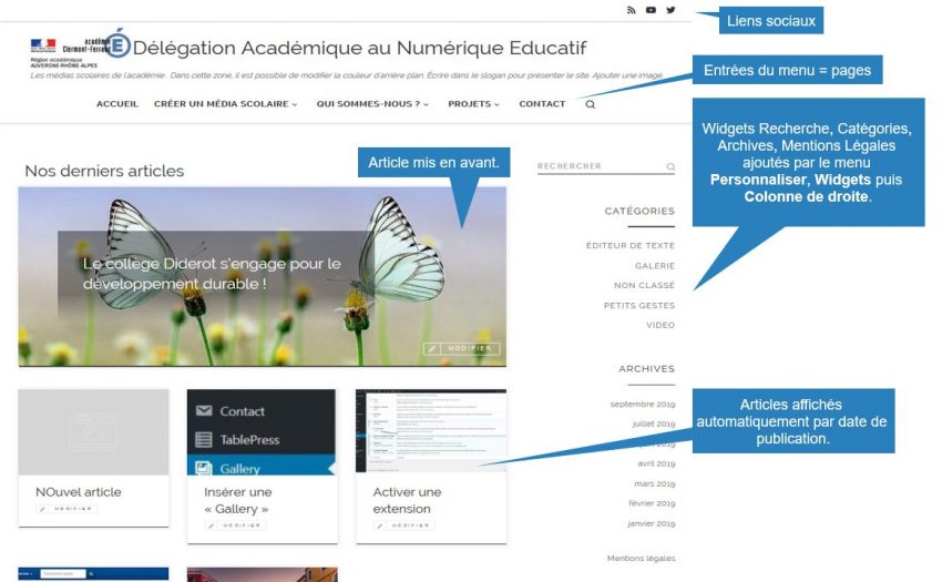 Les pages et les articles représentent deux modes de publication avec WordPress. Les contenus peuvent être du texte, des images, des vidéos, du son…